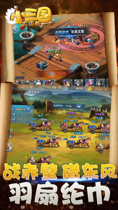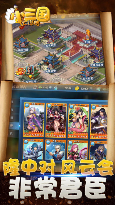 联系我们 客服QQ:2418470849 小三国大谋略是一款三国题材的军团策略手游,将领士兵的独特团战设定,更挑战策略的搭配出征,热血沸腾的攻城侵略带给您全新的战斗体验。 游戏特色 1、军团战争 小兵大将,军团冲锋 自由搭配三国名将和猛将、神射、军师多个兵种,组成最强军团,阵型移动变化多端,冲锋陷阵热血无限。 2、即时战略 战场掠夺,动态出兵 动态出兵应对瞬息万变的战局,突击、包围、截击、远攻,团灭敌军无穷刺激。 3、三国群英 名将争锋,超神大招 数百名三国名将极致养成,阵前铁血对抗。看准时机,指尖大招超神逆转,绝杀强敌。 4、火爆城战 真人对决,智计无双 创新殖民&侵略双城战模式,百人同屏火爆对决。烧脑搭配最强阵容,给对手雷霆一击。现在就派出你的最强军团,集结出发!此外,小三国大谋略还拥有对战、封印、BOSS、火炮攻城战共计四大特色主线玩法和勤王护驾、天下第一、巅峰竞技场、一统中原等丰富迥异的副本玩法。 小三国大谋略,带你重回三国,领略万人军团战!