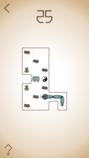 一款灵感来源于贪吃蛇和推箱子的益智解谜游戏 在方格中一步一步移动贪吃蛇,吃掉所有其他动物。和贪吃蛇一样,每吃掉一个动物,蛇就会变长一格。吃光所有动物并到达出口,就可以获得胜利。 *规则来源于经典游戏贪吃蛇和推箱子,简单易懂,5秒上手 *将剪纸与皮影戏结合,独创的清新中国风画面 *老鼠、青蛙、螳螂、大象、乌龟,五种不同效果的动物,与蛇巧妙互动 *还有一个压轴元素,与五种动物都有精妙的联系 *一共50个精巧设计的关卡,每关都有独特之处,绝无雷同的体验 *自带免费无冷却的提示功能,可以随意使用 *追求极简风格,整个游戏只有4个按钮,几乎没有文字