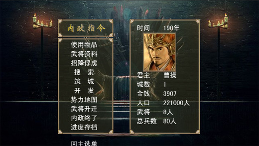 天下大势,分久必合,合久必分,战国七雄争霸归并于秦,秦后楚汉之争归于汉,及至东汉末年桓灵二帝禁锢善类,崇信宦官,以致天下大乱,黄巾蜂拥而起,社稷如累卵之危,苍生如倒悬之急,乱世英雄起四方,谁能救国家于危亡,拯百姓于水火,是足智多某的曹孟德,还是勇冠三军的吕奉先,还是仁义道德的刘玄德,还是决断果敢的孙仲谋......一切都掌握在诸君手中,历史由你书写,乐享百人大战快感,享受名将良臣收集乐趣,那些不可一世的英雄都将在你的麾下集结。你将有机会率领他们讨伐异己,横扫六合。 你要从各路诸侯的围困下寻找出路,谋求发展。全力经营你的领地,攻城破敌之余寻觅和笼络英才,将当年那些风云英杰汇集在你的大旗之下。他们将会为了你的大一统之路,或出谋划策,或征战四方。抖擞威风,让诸侯们在你的怒吼中发抖吧,这一次,你将改写历史。而霸王之业,即将在这里成就。 注:游戏内自带存档修改器