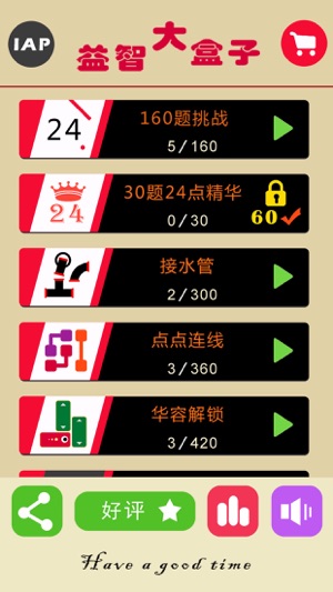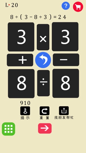 24点之王! 简单上手的扑克数字游戏,颇有难度的关卡题目。 玩法: 给出四个数字,使用加、减、乘、除计算,每个数字只能用一次,计算结果必须是24! 乐趣: 提升计算,提高思维,休闲必备,紧张的学习工作后放松下大脑。 海量关卡+精华关卡。 挑战不断,乐趣无穷! 经典益智数字游戏. 第一章 24点题目 160题 第二章 24点精华 30题 第三章 24点创新玩法 240题