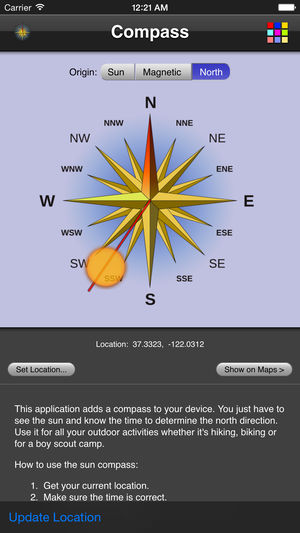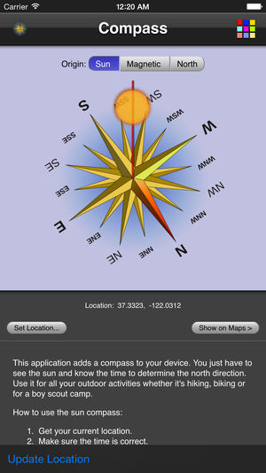 这软件把很有用的指北针加给你 iPhone 和 iPod Touch 。只要看太阳、知几点种,就能定北。你在外边玩,或是去山川逛游、或是在外地骑车等,这个软件会帮你知路。不正的磁性对这个罗盘没影响。