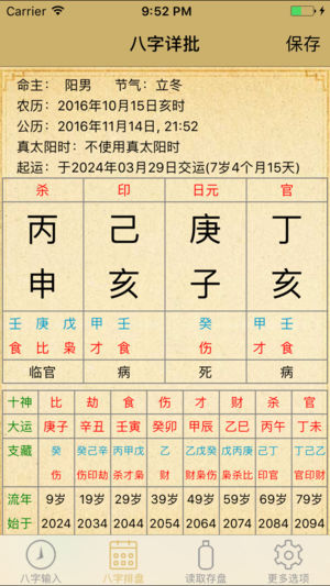功能: -能精確排出八字,因為本軟體的節氣可以說是任何市面上曆法軟體最準確的。 -能排出大運 -能根據指定大運排出流年 -顯示神煞 -曆法支持1645-3000年,任何命理軟體達不到這個曆法準度要求 -支持數據庫保存功能,保存無限多記錄 -增加八字旺衰分析功能,給初學者和專業命理師提供準確的用神分析幫助,這是其他同類軟件極難做到的功能。 -增加八字詳批,含有2萬字以上的人生分析,讓你更快瞭解你的命運。 -新增加保存數據到本地的功能,以後看斷語不需要上網也能看了。 -新增電子郵件發送命盤和解釋的功能。 -增加專家斷語庫,句句都是經典,方便批命的時候作為參考之用。 -增加FACEBOOK,TWIT…