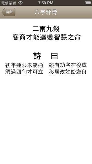 本软件结集流传于民间的传统算命术,内容或解说以古文或民间口传为依据,古今解释可能有所差异,请用家自行领悟。 内容包括: 三世相法(八字秤骨,四季皇帝,骨格贵贱,兄弟,手艺,学堂,屋宇,田产,养牛,养猪) 触机法(眼跳法,耳鸣法,耳热法,面热法,肉颤法,心惊法,喷嚏法,衣留法,釜鸣法,火逸法,犬吠法,鹊噪法) 周公解梦 三字经 千字文 百家姓 红毛番话 本软件依据传统中国玄学时辰计算方式: 年份/生肖以立春为始 月份以节气为始(立春后为一月,惊蛰后为二月,清明后为三月,立夏后为四月,芒种后为五月,小暑后为六月,立秋后为七月,白露后为八月,寒露后为九月,立冬后为十月,大雪后为十一月,小寒后为十二月) 依据中国玄学,月份以节气日为转换,例:2009年4月25日(农历四月初一),仍未过「立夏」,所以是当3月计算。 资料来源/参考: 精考演禽三世相法 作者:不详 年份:不详(现藏于 北京故宫博物院,线:153499) 大字详图三世相演禽骨全本 作者:不详 年份:乾隆五十三年(1788年) 通书:1913年,1924年,1925年 欢迎提供意见可 Email 到 info@firm13.com 或在 App Store 留言 ***用户对本程序的Review: *Funny app - 我觉得三世书几准。download同朋友玩下几好! - Cybermacdonald (Hong Kong) *风水名理不能尽信,但玩玩无防。 - 值得 download ! - Bonny HK (Hong Kong) ***