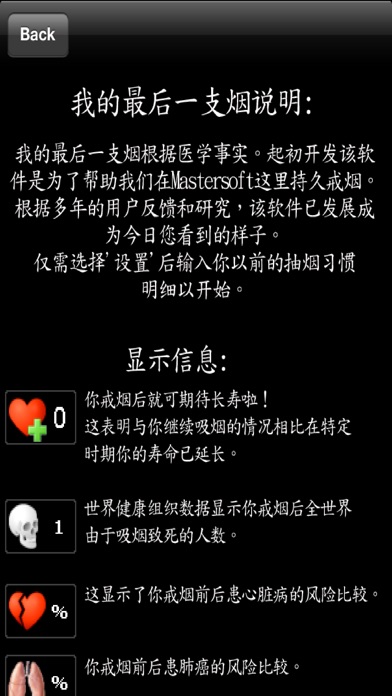 原始戒烟软件—My Last Cigarette(我的最后一根烟),现已全新升级为iOS和OSX专用戒烟软件,和它一起坚持戒烟吧。自2000年以来My Last Cigarette已帮助数千名吸烟者成功戒烟。如果您想认真戒烟的话,那么此款应用程序可让一切改观! My Last Cigarett功效显著! 只需输入您的吸烟习惯和个人详细信息,然后您就会看到各种指示器显示寿命延长、血液循环及肺功能的改善、存款及更多方面的预期值。超过10种不同的显示数据随时通知您,让您戒烟动力十足。适用于iOS的My Last Cigarette有助于抵抗致命烟瘾重犯已得到验证。该应用程序受益于针对吸烟的有害性进行的多年医学研究,是戒烟的重要工具。通过透视您的健康改善状况,从一开始就让您感受到意志力增强且信心坚定。您一定要亲自检验一下这些客户评价。 特点 《读者文摘(美国版)》推荐产品 统计信息实时更新,每秒更新一次! 尼古丁含量读取 预期烟瘾读取 所有计算均根据最新的医学知识和统计数据进行。 每日励志宣言或医疗事实。 每日图片/图表。 每日励志消息 您血液中的一氧化碳浓度 预期延长寿命读取 不吸烟时长读取 未吸香烟根数读取 戒烟前后患心脏病的风险比较 戒烟前后患肺癌的风险比较 省钱 预期血液循环改善 预期肺功能改善 戒烟后死亡几率读取 根据个人从前的抽烟习惯读取数据且每秒更新一次。 专为iPhone,iPad和iPod Touch设计的通用应用程序。无需重复购买。 真实的客户主动评价 请参阅评价。成千上万的人已用我们的应用程序成功戒烟。