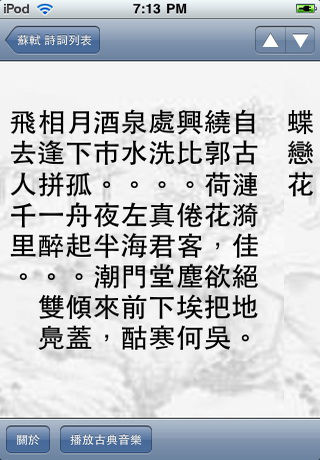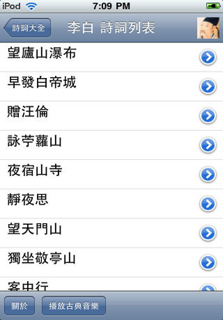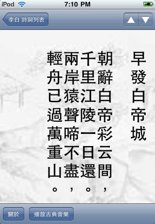 本軟體收錄唐宋詩詞近十萬首,不單單包括唐代和宋代,幾乎各個年代都有收錄,只不過唐宋是詩詞的巔峰,故占的分量比較重。 1.主界面顯示收錄的所有作者,以及所在年代和收藏歌詞 數目,而且支持作者查詢。 2.第二界面列出你選擇作者的所有詩詞,同時還可以查詢 作者的個人資訊以及作品介紹。 3.第三個界面列出你選擇詩詞的內容,可以上一首下一首切換流覽,儘管資料量龐大,但優化了演算法,流覽速度極快。 4.提供古典音樂播放,讓你品賞詩詞的時候,更進一步融入古代的意境。 5.收錄的作者有5200位,收錄詩詞差不多10萬首,體裁包括有七絕、七律、散曲、五絕、宋詞、樂府、雜言等等。 本軟體適合所有對中國古詩感興趣的朋友。 【號外消息】 作者認為還有兩款新軟體值得向各位用戶推薦一下: 1.2010年開運流年命書【虎年運程】,這個不同坊間的流年運程書,這個是根據你的出生時間生辰八字來計算出來的虎年運程,其准確性大大提高。 2.【星占觀心術】軟體,這個是苹果唯一的一個真正占星中文軟件,根據你的出生時間算出天文星盤,然後進行十多項的詳細分析,讓你真正一窺真正占星學的奥妙之處。 詳細可以在APPSTORE裏面查詢 『yixian』(不要输入『』號)即可查到。