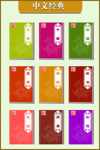 四书为儒家经典,南宋学者朱熹将《礼记》中《大学》、《中庸》两篇拿出来单独成书,和《论语》、《孟子》合为四书。据称它们分别出于早期儒家的四位代表性人物曾参、子思、孔子、孟子,所以称为《四子书》(也称《四子》),简称为《四书》。之后各朝皆以《四书》列为科举考试范围,因而造就《四书》独特的地位。 五经是儒家作为研究基础的古代五本经典书籍的合称,相传它们都经过儒家创始人之一的孔子的编辑或修改。儒家本来有六经,它们是《诗经》、《尚书》、《仪礼》、《乐经》、《周易》和《春秋》。 秦始皇“焚书坑儒”,据说经秦火一炬,《乐经》从此失传,东汉在此基础上加上《论语》、《孝经》,共七经;唐时加上《周礼》、《礼记》、《春秋公羊传》,《春秋穀梁传》、《尔雅》,共十二经;宋时加《孟子》,后有宋刻《十三经注疏》传世。“十三经”是儒家文化的基本著作,就传统观念而言,《易》、《诗》、《书》、《礼》、《春秋》谓之“经”,《左传》、《公羊传》、《穀梁传》属于《春秋经》之“传”,《礼记》、《孝经》、《论语》、《孟子》均为“记”,《尔雅》则是汉代经师的训诂之作。后来的五经是指:《周易》、《尚书》、《诗经》、《礼记》、《左传》。 · 此程序提供简体版本 功能: · 全新的卷轴翻页设计,使阅读效果和纸质书类似 · 自动记录最后阅读位置功能 · 可添加书签功能 · 屏幕点触控制翻页效果 · 专业的编排设计 使用说明: - 点触屏幕上方显现、隐藏选项 - 点触屏幕下方左区去上一页 - 点触屏幕下方右区去下一页 技术支持 如在使用中有任何问题和建议可联系我们: SUPPORT@FEETAN.COM 更多图书,请登录 www.feetan.com *********************************************************