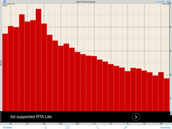 Real Time Analyzer for iPhone. Now you can have an accurate and powerful Real Time Analyzer (RTA) for free on your iPhone or iPod touch. This is the free ad-supported and feature-limited version of our popular and highly rated Studio Six Digital RTA app. It includes 1/3 octave mode and iPhone mic compensation. Unlock this app by in-app purchase to remove ads and to get the same app as our full-featured RTA that is part of the AudioTools suite of apps, including 1/3 octave mode, a range of decay options, Peak Hold, Average Mode, Overlay Curves, Cursor Readout, Save/Recall, and much more! Using ANSI type 1 or better filters, this RTA is very accurate, even in this lite version, since it uses the engine from our full version. Use it to check your sound system, monitor audio, and adjust your car audio system. Try this out, and if you like it you can always upgrade to our full RTA version, or to AudioTools, which includes the full RTA and a lot more. Check out iAudioInterface, our professional-audio test and measurement microphone, line input, and line output accessory made for iPod touch. New! iTestMic is a direct plug-in test & measurement mic that has full pro specs. The full version of RTA, and the version in AudioTools, is ad-free and adds Pink Noise generation, graph zooming, dB/frequency cursor, Max/Min bars, noise curve overlays, Save and Recall of graphs, external mic support, overall SPL A&C dB readout, and decay options including slower decay, and peak hold and average modes, and lots more. *** iPhone mic Frequency Compensation Filter RTA uses a special frequency-compensation filter to flatten the iPhone mic. RTA is designed by the same team that built the Audio Toolbox acoustic analyzer. *** Specifications and Devices The internal iPhone mic has a noise floor near 30 dB, and clips around 105 dB. So, be aware that this tool will NOT work in very loud environments, such as clubs or some concerts.