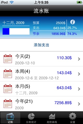 ****流水账是一个日常支出记录软件,只需简单的输入基本的支出信息,就能自动按日、周、月、年统计和浏览支出信息,并提供丰富的统计报表。 ****该软件能对任意的周、月、年进行分类统计,只需要一两次点击,就能让你知道你的钱花到什么地方去了。 ****该软件还能统计你最近30天,最近12周,最近12个月的消费趋势曲线,让你知道你的钱是什么时候花出去的。 ****该软件还提供了简单的预算管理,提醒你不要超支。 软件特点: >简单方便,易于理解,易于使用,输入简单 >可自定义的分类方式 >按日,周,月,年统计和浏览支出条目 >自动形成按周、月、年分阶段的分类统计饼图 >饼图与表格之间能互动操作 >自动形成最近30天,最近12周,最近6个月,最近12个月的消费趋势曲线 >曲线图与表格之间能互动操作 >简单的预算管理和收支平衡报告 >提供密码保护