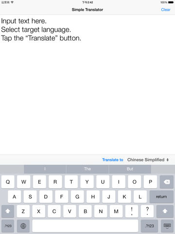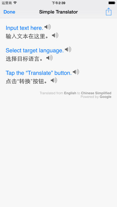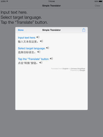 Simple Translator is an universal full text translation tool. =FEATURES= - Voice, or Text To Speech (TTS) for 40 languages - Transliteration for 15 languages - Translate sentences into 57 languages - Auto detecting source language, only need to set target language - Simply switch languages - Share with Email, Twitter, Facebook, Tumblr =40 Supported Voice Languages= English, German, French, Spanish, Italian, Haitian Creole, Afrikaans, Catalan, Albanian, Armenian, Chinese Simplified, Chinese Traditional, Croatian, Czech, Danish, Dutch, Finnish, Greek, Hindi, Hungarian, Icelandic, Indonesian, Japanese, Korean, Latin, Latvian, Macedonian, Norwegian, Polish, Portuguese, Romanian, Russian, Serbian, Slovak, Swahili, Swedish, Turkish, Vietnamese, Welsh =15 Supported Transliteration Languages= Belarusian, Bulgarian, Chinese (Simplified), Chinese (Traditional), Greek, Hindi, Japanese, Korean, Macedonian, Russian, Serbian, Thai, Ukrainian, Armenian, Georgian =58 Supported Languages= Afrikaans, Albanian, Arabic, Belarusian, Bulgarian, Catalan, Chinese, Croatian, Czech, Danish, Dutch, English, Estonian, Filipino, Finnish, French, Galician, German, Greek, Haitian Creole, Hebrew, Hindi, Hungarian, Icelandic, Indonesian, Irish, Italian, Japanese, Korean, Latin, Latvian, Lithuanian, Macedonian, Malay, Maltese, Norwegian, Persian, Polish, Portuguese, Romanian, Russian, Serbian, Slovak, Slovenian, Spanish, Swahili, Swedish, Thai, Turkish, Ukrainian, Vietnamese, Welsh, Yiddish, Armenian, Azerbaijani, Basque, Georgian, Urdu