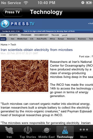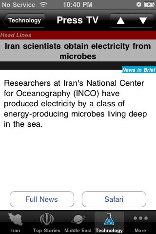 Iran News 24/7 is a very simple e-news reader for the people of Iran. This app brings you the latest news from all the top Iranian news sources. Ours is the first iPhone/iTouch newspaper app for the people of Iran. The news is categorized as, Iran News Top Stories Middle East Technology Sports Health The application is free from Ads. The app reads the news headlines and stories and places them into scrollable list. When a headline is selected, a full screen window opens with the cover story. This new window also holds up and down arrow to browse all the news. It contains Full News button which displays full news content on the same window and Safari Button which opens the news in safari browser.