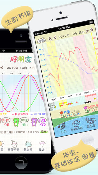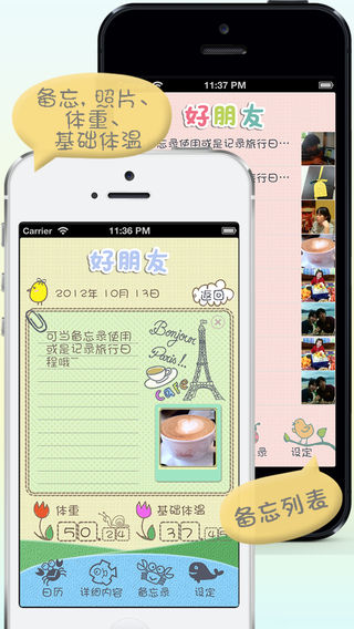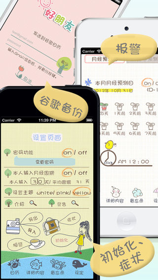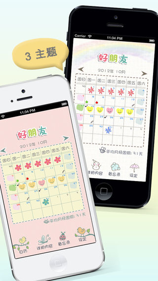 30万用户选择的最顶级程序! 和可爱的三种主题一起 通过提供多种功能变得更加便利的“好朋友”! 现在请不要在其他月经周期程序之间苦恼了! 4年间经过众多用户验证的“女性感觉”才是正确答案。 “好朋友”将为满足大家的需求负责到底。:-) *** New and Noteworthy in Japan *** *** What's Hot in South Korea *** *** Top Paid App in Taiwan *** *** Top Paid App in South Korea *** *** Top Paid App in Japan *** *** Top Paid of Health Category in Mexico *** *** Top Paid of Health Category in China *** *** Top Paid of Health Category in Bulgaria *** *** Top Paid of Health Category in Hong Kong *** *** Top Paid of Health Category in Spain *** *** Top Paid of Health Category in Indonesia *** 好朋友!! 最低价! 完善的功能! 可爱的设计! 每月忠实来访的[好朋友]!! 可爱女生的聪明选择! 您在为计算[好朋友]的来访日而烦恼吗? 这么特别的一位[好朋友]不彻底认识她、对待她实在有违朋友道义。 要了解她并不困难,看似琐碎,复杂的计算方法其实可以一目了然。 好朋友 日历 帮你计算下次月经日期,排卵日期以及生理周期。 “备忘录”功能帮你纪录旅行日程和重要约会,“我的秘密”功能记录着你和[好朋友]之间的秘密。 可爱界面,设计简单,操作方便的 好朋友 日历帮你打造有计划,有条理的生活,是你和[好朋友]和平共处的必须品。 《适用人群》 1. 如果您想方便纪录月经期,准确推算下一次月经来潮和排卵日 2. 如果您想准确计算月经周期 3. 如果您正在计划出门旅行或是重要约会 4. 如果您正在准备怀孕 5. 如果您想避开受孕日 6. 如果您是一位懂得呵护另一半的绅士 《主要功能》 1. 简单操作 - 记录月经周期 - 设置并记录 有房事 - 设置并记录避孕日 - 按日期使用备忘录 2. 计算平均月经周期 3. 显示下次月经日期,排卵日期 (可使用平均周期 及 个人设定) 4. 备忘录功能 5. 我的秘密功能 6. 用谷歌日历备份文件及恢复 7. Bio-Rhythm 8. 基礎体温/体重表(最近 1年) 9. Slide touch & Swipe control (日历, 备忘录, Bio-Rhythm, 基礎体温, 体重) 10. 报警 11. 症状功能