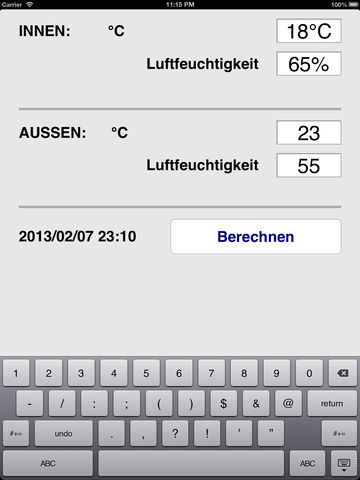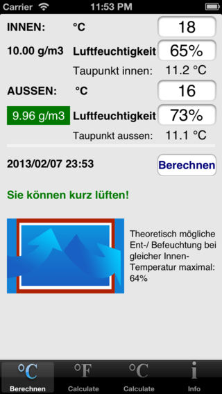 Das Programm VentilateClever wurde unter iOS 5.1 entwickelt und mit iPhone und iPad getestet. Messgerät für Temperatur und Luftfeuchtigkeit Beachten Sie, dass für die Nutzung dieses Programmes ein Messgerät nötig ist, welches die Temperatur und die Luftfeuchtigkeit jeweils im Gebäude und ausserhalb messen kann. Ideal ist ein Gerät mit einem via Funk verbundenen Aussensensor, der sich geschützt vor Regen im Schatten befindet. Die Messgenauigkeit sinkt bei sehr hohen Luftfeuchtigkeitswerten. Manchmal differieren Innen- und Aussensensor selbst unter exakt den gleichen Bedingungen. Daher empfiehlt es sich, die Werte auf- bzw. abzurunden. Das Programm berechnet die Luftfeuchtigkeit zwar auch für die erste Dezimale der Temperatur durch eine Annäherung recht genau, doch lassen Sie sich dadurch nicht täuschen. Die Messtoleranz Ihres Gerätes ist wahrscheinlich höher als ± 1% Luftfeuchtigkeit. Die Messgenauigkeit bei der Temperaturmesseung dürfte hingegen ± 0.2 °C betragen. Temperaturbereich Mit dem Programm lässt sich aus der relativen Luftfeuchtigkeit für den Temperaturbereich von -10°C bis 35 °C berechnen. Das dürfte die Bedürfnisse der meisten Anwender abdecken. Das Programm führt die Berechnung auch in °Fahrenheit durch. Die Bedienung erfolgt dann in englischer Sprache. Taupunkt Seit Version 2.0 wird für innen und aussen je der Taupunkt berechnet. Das ist jene Temperatur, bei der Kondensation eintritt. Die Werte sind mit Hilfe einer Annäherungsformel berechnet, die sowohl über 0°C als auch unter 0°C eine Abweichung von ledilgich ± 0.1°C ergeben. Es hat übrigens bei der Messgenauigkeit der Geräte keinen Sinn, zwei Dezimalstellen anzugeben. Es wird empfohlen auf die ganzzahlige Temperatur aufzurunden. Dann ist man auf der sicheren Seite. Es wird empfohlen, Malarbeiten mindestens drei Grad über dem Taupunkt auszuführen. Hauptanwendungsbereich: historische Gebäude, Kirchen etc. Die hier empfohlene Vorgehensweise hat sich vor allem bei historischen Gebäuden, z.B. Kirchen mit dicken Mauern bewährt. Die Raumtemperatur bleibt durch das Mauerwerk auch beim Lüften relativ stabil, so dass der durch die Applikation berechnete Entfeuchtungseffekt bis zu einem gewissen Grad erreicht werden kann. Holzhäuser haben hingegen eine andere Charakteristik. Sie passen sich der Umgebungstemperatur viel schneller an. Hier ist es wichtig, mit Hilfe dieses Programmes Erfahrungen zu sammeln und diese beim Lüften zu berücksichtigen. Jedes Gebäude hat eine eigene Charakteristik und kann je nach der Beschaffenheit des Mobiliars, der Böden und der Decken in gewissem Mass Feuchtigkeit speichern und wieder abgeben. Nach dem Lüften kann sich die Luftfeuchtigkeit dadurch wieder leicht erhöhen. Was sonst noch zu beachten ist Beachten Sie auch, dass bei einer grossen Temperaturdifferenz, z.B. im Winter aus Energiespargründen nur kurz gelüftet werden sollte. Während im Winter die Luftfeuchtigkeit innen eher zu gering ist, ist sie im Sommer eher zu hoch. Anzustreben ist ein Bereich von 50 bis maximal 70% relative Luftfeuchtigkeit. Nicht immer lässt sich die Luftfeuchtigkeit allein durch Lüften im gewünschten Bereich halten. In gut geheizten Räumen kann im Winter oft eine rel. Luftfeuchtigkeit von 50% nur mit einem Luftbefeuchter erzielt werden. Umgekehrt ist es im Sommer bei längeren Regenperioden nötig, einen Entfeuchter einzusetzen, um nicht über 70% zu kommen. Wird allerdings clever gelüftet, kann bei grossen Gebäuden oft durch 30 min. intensives Lüften ein grösserer Effekt erzielt werden, als durch den stundenlangen Betrieb eines Entfeuchters. Ab 70% Luftfeuchtigkeit kann sich Schimmel bilden. Am Schädlichsten sind jene Situationen, bei denen warme Luft an kalten Wänden Kondensate bildet. Das ist der Fall, wenn die Temperatur der Wand der Taupunkttemperatur entspricht oder sie unterschreitet. Das Programm weist Sie u.U. auf entsprechende Gefahren hin.