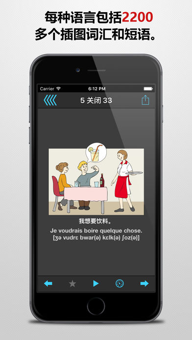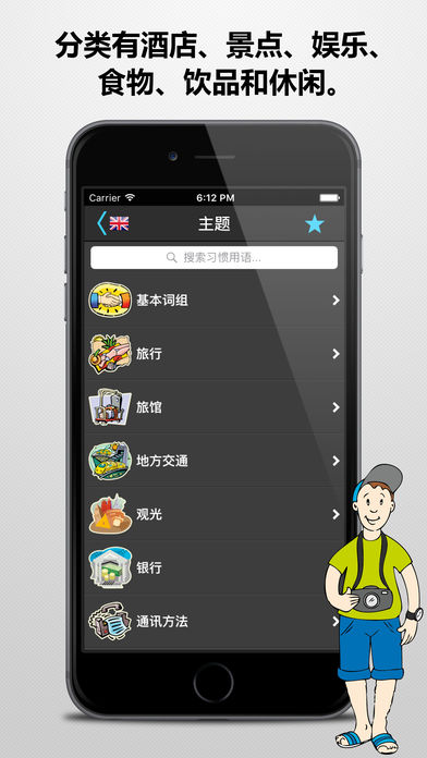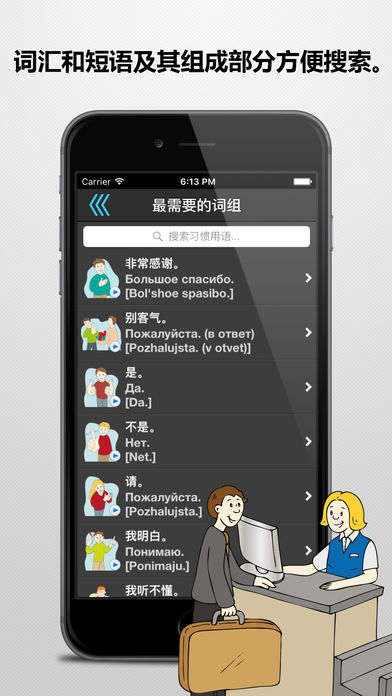 让您的iPhone或者iPod touch成为您掌握34种语言的口译员。 旅行译宝是一种带有语音功能的图解词典,能够将中文单词以及习惯用语译成34种语言。 该程序为身处海外且无外语知识的您提供了独一无二的沟通交流渠道,这是由于其独特的语音功能可以在需要时对译文进行朗读。 浅显易懂的图解使得沟通变得更加明了。 通过旅行译宝的帮助,您还可在不懂语言的情况下预订机票、酒店、饭店,或是将汽车送去修理。 每种语言包含多达2200条习惯用语和词汇,并依据不同主题进行分类,让您一目了然。例如:海关、酒店、服务、行车、汽车修理部、景观、娱乐、饮食、体育和休闲。 集成的搜索功能将大大提高您的效率。 例如:当您需要预订酒店单人房,只需输入“单人”二字,即可查找到并显示相应的句子“我想要单人房”。 • 每种语言包含2200条图解以及带有语音的习惯用语和词汇。 • 34种语言:英语(美国),英语(英国),德语,法语,西班牙语(西班牙),西班牙语(拉丁美洲),,意大利语,葡萄牙语(葡萄牙),葡萄牙语(巴西),丹麦语,荷兰语,芬兰语,瑞典语,挪威语,波兰语,捷克语,斯洛伐克语,俄语,保加利亚语,希腊语,匈牙利语,土耳其语,日语,阿拉伯语,韩语,阿拉伯语,希伯来语,泰语,印度语,越南语,波斯语、克罗地亚语、加泰罗尼亚语、乌克兰语和罗马尼亚语。 • 收藏夹类别栏用于保存单词和词组至您自己的列表。 • 练习基于记忆卡片演练的概念之上,您可从您的收藏加列表中学习单词和词组 • 您可以使用分享按钮在社交媒体上给您的朋友发送带图片的短语。 • 有允许您减慢外语词语和短语播放速度的功能 • 所有的习惯用语都带有母语发音。 • 根据主题和副主题进行的分类精准易懂。 • 快速全文搜索,还拥有不完全词汇搜索。 • 所有内容都预设于设备内,因此无需任何网络连接。 • 每一个词条都配有图解,使得沟通更加简单。 • 全中文用户界面。 • 操作非常简单,老少皆宜。 • 包含下列语种的音标:日语,韩语,俄语,希腊语,阿拉伯语和希伯来语。