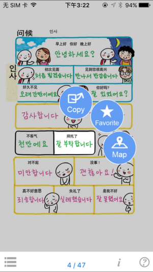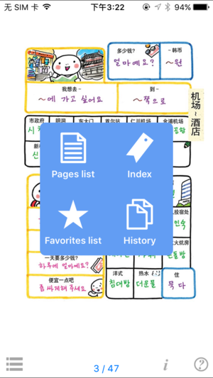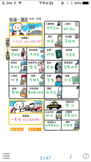 【[作者]/[出版社]】情报中心出版局 本软件是突破450万部的最畅销系列“旅行指指通会話”的iPhone应用软件。本软件是为了因观光、留学、商务等目的来到韩国的中国人而制作的会话手册。 【主要特征】 ■语音功能 点击画面,可反复倾听韩语发音。 ■按情景的不同显示语言! 彻底涵盖了基本用语。 ■自由自在的放大或缩小画面。 用两个手指点击、滑动屏幕可以放大或缩小画面。 ■附有简易插图 附有了插图,可以更容易找到想要查询的对话,丰富您的旅途。将更有利于您今后学习韩语。 【目录】 ●问候 机场〜酒店 问候 打招呼 自我介绍 ●移动 行街 交通工具 ●购物…