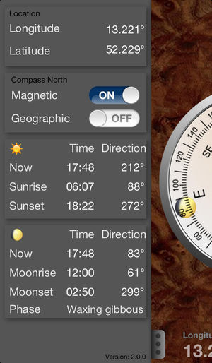 ***** Supports new iOS 9 This beautiful designed Compass App shows beside the heading also the current Sun and Moon positions. Additionally this App calculates Sunrise, Sunset, Moonrise, Moonset, the corresponding directions and the Moon phase. Most devices and their build in sensors are supporte…