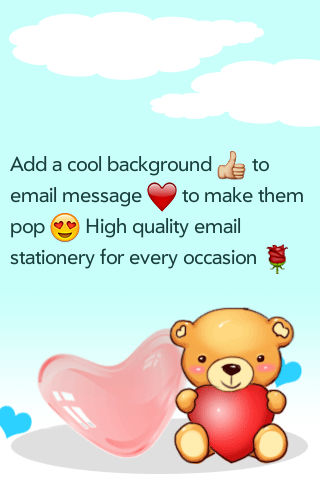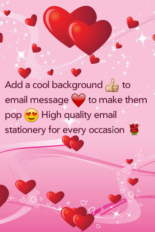 This app has many of unique and high quality email stationery / themes / backgrounds to choose from. Add a cool background to email messages to make them pop! Best of all, the backgrounds look great on iPhone, iPod Touch, iPad as well as Outlook, Gmail, Yahoo and Hotmail web based email clients. - Added new feature to convert iphone emoji icons to images so they can be seen by any Email Client (Gmail, Yahoo Mail, Hotmail, Outlook...) We will add more designs every week. If you like this app, then please tell your friends. The more users download this app, the more backgrounds will be added. List of category: - Abstract - Animals - Anniversary - Birthday - Flowers - Fun - Love - Mother's Day - Nature - Patterns - Sports - Father's Day - Wedding - Baby - Get Well - Thank You - Summer - Halloween - Fall - Thanksgiving - Christmas - Winter - New Year - Valentine - Easter and more coming soon...