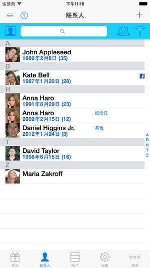 生日列表、联系人列表和生日通知,还兼容XING和VK。 BirthdaysPro 可显示您的通讯录中所有联系人将到来的生日。 主要功能: • 生日列表按日期排序 • 周年纪念日和其他日期 • 每个生日可收到多达 2 条提醒消息。 • 导出到文件(Excel和CSV),除了社交网络。 • 从XING或VK显示/导入生日。 • 发表信息到涂鸦墙 (VK)。 • 与日历同步 • 在 BirthdaysPro 中直接添加或编辑生日。 • 查看您的联系人的年龄、照片和通讯录数据。 • 重复提醒 (参见帮助)。 • 数据传输到其他设备 (蓝牙)。 • 密码锁定 • 备注 • 星座 (汉语) • 组…