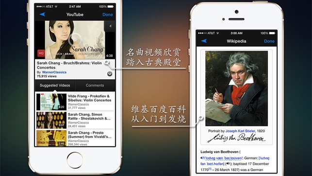 * 全球排行第一的古典音乐类应用! * 最新 iOS 以及 iPhone /iPad 优化! * 苹果应用商店以及美国纽约时报大力推荐的经典音乐软件 * 中英文对照,音频展视器,维基/百度百科切换,优酷/YouTube视频,收藏夹,计时器,及触屏控制等更多功能! "音乐,使男人激情燃烧,女人潸然泪下。" —— 贝多芬 "太喜欢了,每天和家人一起分享,以前许多旋律熟悉叫不上名字的歌曲也知道了名字,品位人士的首选!" —— 加菲大王 "音乐经典优美,令常常在下班路上疲惫的我得到休息,陶醉忘我!期待有不断升级,增加曲目,谢谢!" —— 丸仔 "iPhone上软件来来去去,这个始终保留着。曲目…