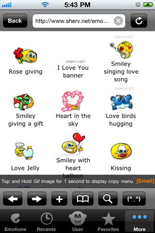 让你的彩信快乐的动起来吧,是否已经厌倦了那些呆板的文字,来点有有意的,让你开心一笑的表情吧。 功能: 1。内置2000多个经典好玩的表情 2。可以方便的使用于彩信,邮件中 3。可以复制其他表情(不仅仅是本应用内置的2000多个表情,还可以复制其他应用里面的gif表情)到我们的应用来,从而可以自定义自己的表情 3。可以创建自己的表情分类,便于管理自己的自定义表情