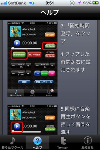 ★雑誌掲載実績★ ・『CUTiE』(キューティ)2011年3月号にもご紹介頂きました!女性にも優しいアプリ ・落としたい!! 使えるiPhone4アプリ厳選集(1/28) ・宝島社のAKBが表紙のsmartにて紹介されました!(11/24) ※smartは男性ファッション誌国内NO.1のオシャレな雑誌です。(あのメンズノンノよりも売れています!) おかげさまで日本での有料ランキング2位、ミュージックカテゴリ1位!(2010年実績) 海外でもご評価頂いております! ■ミュージックカテゴリ1位 フランス・イタリア・ルクセンブルグなど5カ国 その他10位以内には20カ国ランクイン♪ 多彩な機能搭載です! ■ver.3 新機能 ・イコライザー機能追加!(DanceやRockなど曲調の変更) ・着うたファイルの同期方法を追加(メール or PC接続) ・twitterで着うたの曲と時間をつぶやけます ■ver.2の追加機能 ・フェードイン、フェードアウトの追加 ・再生スピードの変更 ■お楽しみトリビア 速度調整をすることにより、平井堅さん⇄一青窈さん お互いの歌声がかなり近くなります。 どうぞお試しください♪ -speed設定 0.825〜0.800 一青窈さんの曲が平井堅さんの歌声に! 1.175〜1.200 平井堅さんの曲が一青窈さんの歌声に! --- --- --- --- --- --- --- --- --- --- --- --- iPhoneに足りない機能はなんだろう? この魔法のアイテムに唯一足りなかったもの それが自分のお気に入りの曲の「着うた(着メロ)」作成・設定です!! itunesを使って色々な設定を変更したり試行錯誤すると作成できるのですが、それよりももっと簡単にiPhoneの中に入っている曲を利用して「着うた(着メロ)」を作成するアプリが完成しました!!! ■仕組みはいたって簡単(着うた作成方法) ①iPhoneに登録されている曲の中から着うたにしたい曲を選択! ②着信音にしたい部分を調整(40秒以内) ③ワンクリックで着信音用に変換し、あなたのPCへメールで送信します。 ④届いたメールの添付ファイルを「iTunes」にドラック&ドロップすると「着信音」といフォルダが新規作成されます。 ⑤iPhoneを同期する(着信音の同期) ⑥iPhoneの「設定」→「サウンド」→「着信音」で「カスタム」の中に曲が登録されますのでこれで完成です!! 難しい設定などが苦手な女性の方でも簡単に「着うた(着メロ)」が作れちゃいます! 着信音が変われば気分も変わる! お気に入りの一曲で早速「着うた」を作成しよう~♪ --------【注意事項】-------- メール着信音に設定する場合は、20秒以内で作成してください。 iPhone 3GS以上限定となりますのでご注意ください。(特にiPhone3G端末の方はご利用頂けませんのでお気をつけください。) ※対応ファイル形式:AAC(保護なし)、MP3、WAV iTunesよりダウンロードされた曲は、だいたい保護されているため着うたに変換出来ないケースが多いです。 ※SMS/MMSでの着うたはiOS5にバージョンアップしてください。 ※アプリに関するお問い合わせフォームはこちら http://bit.ly/ifUE7v