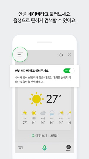 모바일에 최적화된 네이버앱으로 매일 다양하고 유용한 정보를 만나보세요. 1) 메인을 내 마음대로! 메인 메뉴탭 끝의 + 아이콘을 눌러보세요. 마음에 드는 콘텐츠를 추가하거나 보고 싶은 순서대로 정렬할 수 있어요. 2) 이미지로 검색하는 스마트렌즈, 쇼핑렌즈 말로 설명하기 어려울 땐 검색창에서 카메라 아이콘을 눌러 이미지로 검색해보세요. 이미지를 인식해 사물, QR코드, 장소, 쇼핑 아이템을 찾아드려요. 3) 소리로 검색하는 음성검색 검색창에서 마이크 아이콘을 눌러 궁금한 것을 물어보세요. 음성을 인식하여 필요한 정보를 알려드려…