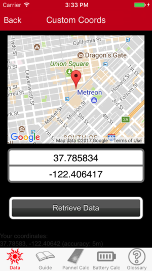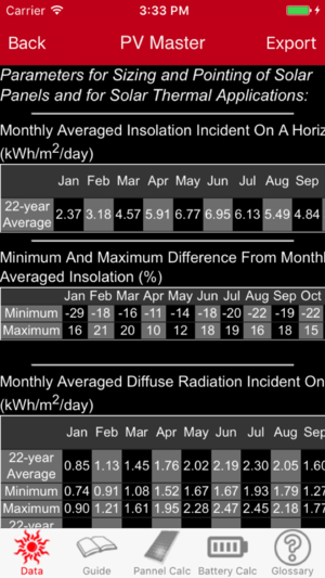 ************************************* 找到所有的光伏发电数据,您需要为您的位置。 *********** 当你手动输入坐标,他们必须以十进制格式。 如果不能确定,从谷歌地图上的坐标。 ************ “这iPad和iPhone的应用程序是一个全面的工具,旨在帮助太阳能专业计算基本上是一个光伏阵列的各个方面,包括天气信息,如晴朗的天空天,在整个一年多小时的太阳角度。 它不会停在那里,虽然。应用程序生成信息系统的大小,你需要多少面板,将它。它还计算的电池备份的大小是建议的系统。这个应用程序还包括一个引导和词汇表,用户可以得到更多的信息。 基本上,…