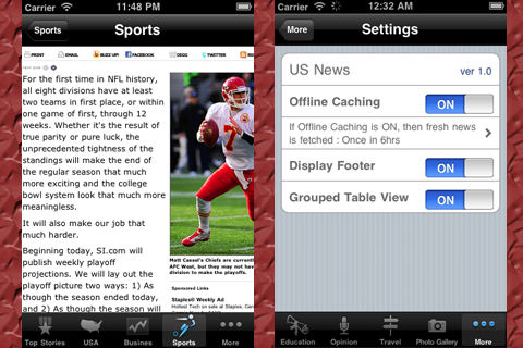 US News, 24/7 is a very simple e-news reader for the people of USA. This app brings you the latest news from all the top American news sources The news is categorized as, USA News Top Stories Business Sports World Weather Science Technology Environment Health Politics Entertainment Movies Music Lifestyle Education Travel Opinion Photo Gallery > Offline Caching of News (Works with out internet connection) > Emailing of news articles > Customized news table view > iOS 4.0 & iPad Compatibility > Supports both RSS & Atom feeds > Portrait & Landscape orientation