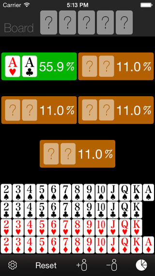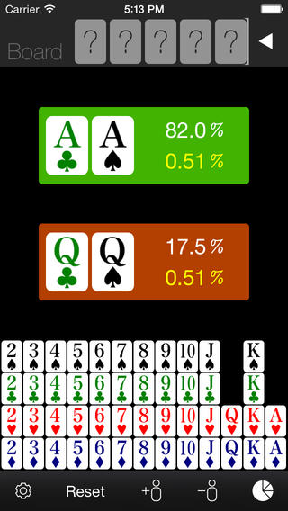 Easy to use odds calculator for Texas Hold'em. Just drag and drop cards into place! Supports two modes of operation: 1. Player vs. Opponents 2. Hand Rankings (pie chart) Key features: 1. Calculates equity probability of each player. 2. Color to indicate strength: red (weak) to green (strong) 3. Calculates probability of a Royal Flush, Straight Flush, 4 of a kind, Full House, Flush, Straight, 3 of kind, 2 pair, pair and high card. 4. Supports up to 10 players in player vs opponents mode. 5. INTERNET CONNECTION IS NOT NEEDED. 6. four color suits option. Advanced Features: (turn on advanced features in settings) 1. Deal to pre-flop, flop, turn, or river. 2. Fold players (press and hold player) 3. win and tie percentages (tap player) If you like this app, try Poker Odds Pro, which includes hand ranges and more.