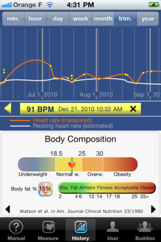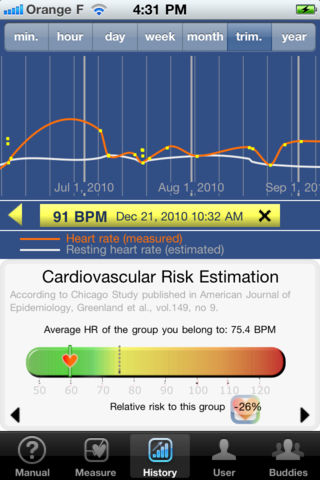 Sens'Care uses the built-in camera to measure your heart rate and track its evolution. This allows you to keep track of your resting heart rate, the proved approach to monitoring your heart health and preventing related diseases. “Epidemiological studies show that a resting tachycardia is associated with increased risk of cardiovascular disease and sudden death. Elevated heart rate is also highly and independently predictive of 6-month and 1-year mortality following acute myocardial infarction.” Henry Purcell, MB, PhD (Senior Fellow in Cardiology - Royal Brompton Hospital - London – UK). “We carry in us a sudden death risk and information is comprised in the heart rate”. Xavier Jouven, MD (European hospital Georges Pompidou, Paris - France). The heart rate profile at rest or during an effort is an strong predictive factor of sudden death according to the French study conducted by Xavier Jouven MD and published is the New England Journal of Medicine. ------- Features : - Real time physiological signal and automatic finger detection - Instant Heart Rate and average over signal - Store Historical Data on Interactive Scalable Curve, including automatic resting HR estimation - Assessment of Cardiovascular Risk and Heart Fitness Evaluation - Results and statistics compared to Average Population (according to a large Epidemiologic study of 40k volunteers followed during 22 years) SensCare (c) - Your Health Matters.
