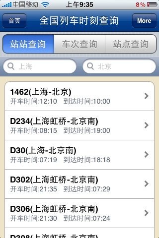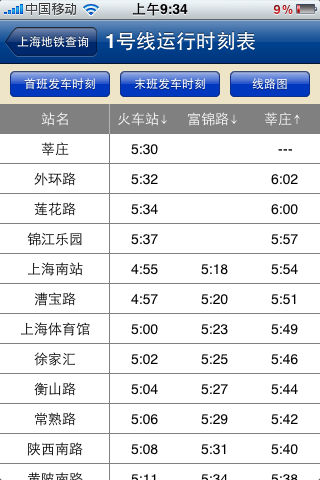 这是Iphone中最好的上海交通出行查询软件,包含上海的公交、上海地铁、全国列国时刻、全国航班查询,有了它您的出行将更加方便,绝对物超所值。 软件特色: ----------------------- ★上海公交查询:包含上最新的1000多条线路信息,4万个站点信息,数据库采用最新的公交数据库。公交信息包括:公交线路信息、公交车站(来回)、起始时间、票制、票价、距离等数据,软件强大的搜索功能,不仅包括站点搜索同时包括站点搜索。无论你是日常生活使用,还是出行旅游使用,都会给你带来很大的帮助。 ★上海地铁查询:上海最新的地铁信息、地铁每条线路的时刻表、每条线路都配有精美的线路地图,让你查找更直观,同时软件提供方便的搜索功能,让你能够第一时间找到你需要的站点。 ★全国列车时刻表查询:软件使用了最新的列车时刻数据,并且提供了:站站查询(上海-北京)、站点查询、车次查询等多种查询方式,让你最快的找到你要的信息。软件含最新沪宁本线高速列车(G开头)、跨线动车组列车(D开头)时刻数据。 ★全国航班查询:软件使用了全国最新的航班数据,让你第一时间掌握你的航班信息,软件界面友好,数据查询方便。
