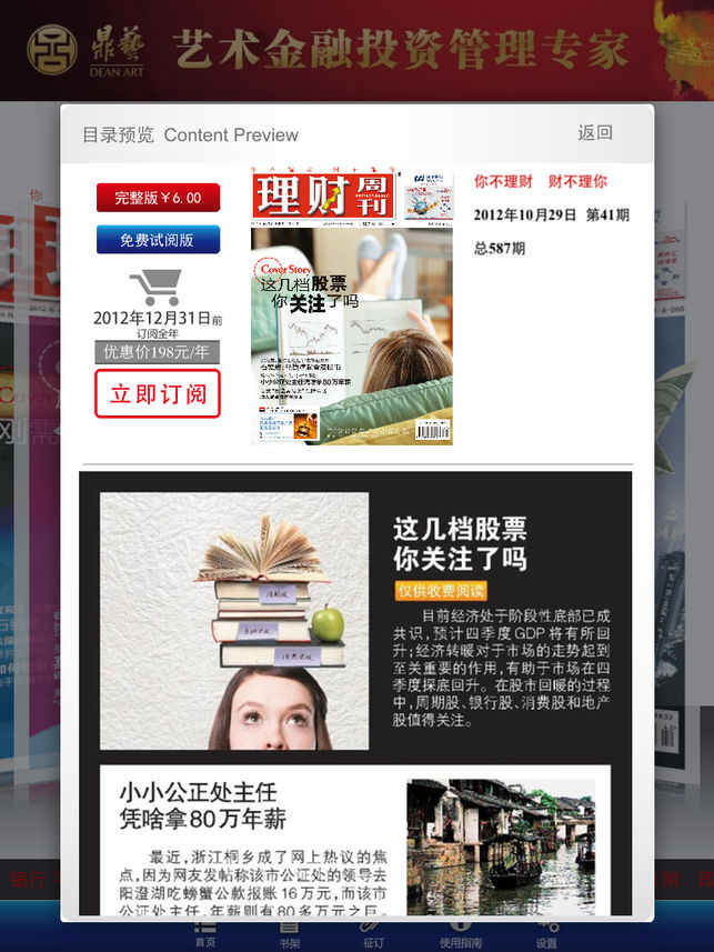 《理财周刊》是一本面向个人、家庭的实用性投资理财专业杂志,为读者提供全面、及时、准确的投资理财资讯,帮助读者全面树立正确的理财观念,提升理财技能。 【苹果官方阅读功能注意事项】 苹果将App Store官方订阅功能设计为自动续费订阅,除非用户手动在iTunes账户设置中停止订阅,否则订阅会自动延续,用户信用卡也会被自动扣除相关费用,请读者务必留意。 苹果App Store官方订阅功能使用的是时间段选项,而非具体杂志期号选项,因此,使用这一订阅方式的用户,购买的是在某一时间段之内的杂志。我们不能保证在一年的订阅周期内用户收到的杂志是一个固定数量,用户可能在某一个时间段内因为休刊而没有杂志可以…