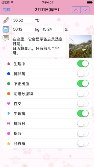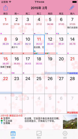 “Ladi Cal“是一个应用程序来管理,妇女的基础体温。 显示下次经期和排卵将进入一个温度和少数项目,每天早上预定日期。该图显示了体温再次发生变化。 ※您可以查看图表和日历以及输入体重和身体脂肪百分比以及温度。 通过在基础体温和身体脂肪百分比,体重变化,请帮助管理你的健康。 “Ladi Cal“功能,如下所示。 【输入和显示的基础体温】 每天早晨基础体温,进入日历将在图形显示。在低温日历上的蓝色高温,显示为红色。 【输入和显示体重和身体脂肪百分比】 和图形显示在日历以及在基底体重和身体脂肪率输入的值。 【 Share data with Health app】 Ladi…