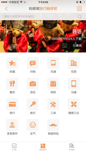真人发音语言包免费下载,覆盖所有常用外语语种,旅行中的所有应用场景一应俱全,陪你轻松走遍世界每一个角落。 1)真人发音,即学即用 2)离线使用,不怕没WiFi 3)即时翻译,哪句不会问哪句 4)内含丰富的语言包 -17种旅行热门语言:英语、日语、韩语、泰语、俄语、德语、意大利语、西班牙语、法语、土耳其语、葡萄牙语、希腊语、印尼语、阿拉伯语、马来语、斯瓦西里语、越南语…… -8个旅行地口语:济州岛、首尔、曼谷、清迈、普吉岛、马尔代夫、巴厘岛、东南亚 -13种国内方言:成都话、粤语、苏州话、河南话、重庆话、客家话、温州话、武汉话、胶东话、上海话、藏语、台湾话、维吾尔语 -多个娱乐专题:世界杯、奥运…