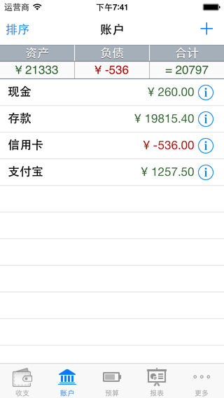 [i理财]是一个非常易于理解和使用,但又功能强大的财务管理软件。程序界面友好、直观、清爽,只需极少量的数据录入,就能实现收入、支出、账户、预算等全面的财务管理功能。 ***本软件在全球多个地区被选入财务类New & Noteworthy推荐榜*** 曾获: 台湾区总榜第二 台湾区财务类第一 香港区财务类第一 中国区财务类第二 澳大利亚区财务类第二 美国区财务类前十 加拿大区财务类前十 ...... 功能和特点: 收入和支出跟踪 * 程序可以快速,方便的添加和跟踪你的收入和支出,能自动按日,周,月,年统计收入和支出的合计值,并计算收支平衡值。 * 可以从时间/分类/账户等多种角度浏览和搜索历史记录。 * 能自动记录最近添加或修改的10条记录。 * 支持周期性收支和转账记录的自动创建。 * 支持模板功能,最快只需两次点击就能记一笔账。 多账户管理 * 可以创建多个账户并设定账户的初始余额。 * 账户之间可以自由的转账。 * 可自由调整帐户显示顺序。 * 可查看帐户的收入、支出和转账明细。 自定义分类 * 程序预置了多种常见的收支分类。 * 可以添加你自己的分类。 * 能自由的调整分类的显示顺序。 * 可以为分类添加图标,程序内置了超过460个精美的图标。 针对分类的月度预算 * 可以按收入或支出的分类制定月度预算,跟踪预算的完成进度。 * 能根据预算类型(收入/支出)和完成情况(未完成/已完成或超出),用不同的颜色显示预算执行进度。 * 能查看预算相关的收支明细。 动态可视化的报表 * 能自动生成收支对比饼图、资产组成饼图、债务分类饼图、收入分类饼图、支出分类饼图、收入变化趋势、支出变化趋势等多种可视化报表。 * 曲线图和饼图都具有动态交互能力,触摸图形能自动在表格中定位相应的记录,反之亦然。 更多 * 密码保护,数据备份让你的财务数据更安全。 * 支持导出数据到Excel * 支持iTunes,Wifi,email等多种方式的数据备份和恢复。 * 提供了每日记账提醒功能。 * 充分考虑手机操作的特点,所有按键都隔开适当的距离,防止误操作。 * 界面清爽、直观,程序稳定可靠。 如有任何意见、建议或疑问,请联系: 邮件:hcyanli@gmail.com