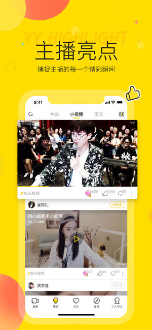 YY-全民娱乐的互动直播平台, 10亿用户陪你乐翻天! 【火热频道 精彩不断】 【频道】音乐、脱口秀、舞蹈、户外、吃鸡、手游、喊麦、直播购、体育、二次元、交友、综合 【亮点】主播的精彩时刻聚集地,展现主播更多才艺 【锁定YY 陪你玩到嗨】 好声音剧场:音乐达人,街头音乐人聚集地,打造极具享受的视听盛宴。 户外直播:带你钓鱼,带你游山玩水~世界那么大,来YY看看。 二次元频道,声控福利社,给你耳朵最高级的享受 【明星大神 制霸全场】 摩登兄弟:超人气实力派才艺主播现场献唱 崔阿扎:千万周星女王,演员、歌手、主播多栖发展的全能型艺人 A+:绝地求生顶级主播,IFTY队长,世界级公认的“神枪…