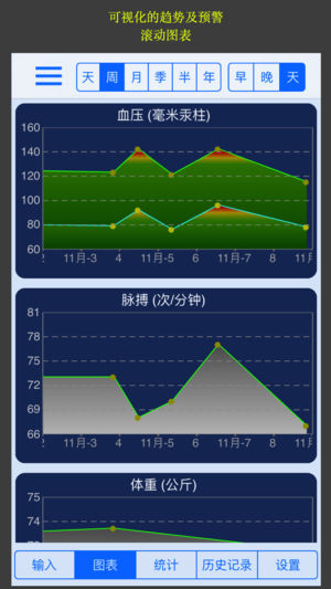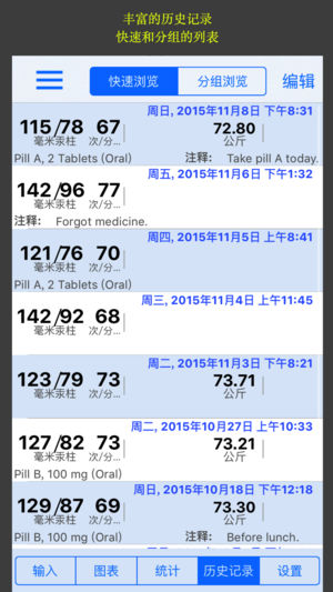 血压记录是您了解和掌握您的血压以及体重必备的应用。 它可保存无限多的血压记录,并将数据图表化。它还会为您提供数据统计分析报告,为您找出血压和药物治疗的关联性。它还可以把数据以电邮的形式输出,以文件形式导入, 同时为您设置事项提醒。总之这是一款功能强大的健康生活所必备的应用。 综合的数据收集 - 您难道不想只用一个应用程序来记录所有的健康和医疗数据吗?这个应用程序就是为此设计的。 全面综合的数据收集表 (部分项目需升级) 可自由调整的输入数据表格 简单的用户界面 优化的键盘选择 药物治疗关联性 - 您是否一直想了解药物治疗究竟是怎样影响您的生命体征的呢?血压值在左右手臂上有何不同?…