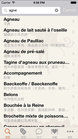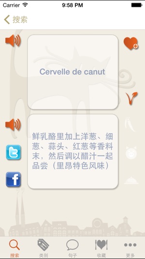-- 瑞士、德国、奥地利最受欢迎APP应用软件Top 5-- -- 十余个国家最受欢迎饮食类APP应用软件-- 想知道“cervelle de canut”在法式菜单上是什么意思吗?马上点击下载“法餐一点通/Bon appétit”应用软件,你将能迅速找到答案哦!“cervelle de canut”意为:新鲜白奶酪配以韭菜,大蒜,葱,果醋和橄榄油,里昂地区特色菜肴。 使用者评述:澳大利亚 2012年11月1日 Tracysays: 5星 太棒了!我超级喜欢这款应用软件,容易使用,而且可以发声!比以前的菜单字典要好用多了! 翻译质量保证: 安吉尔女士,法国专业翻译作者,从事翻译事…