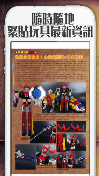 香港雜誌『GIGA HOBBY 玩具月刊』隆重降臨iPhone和iPad平台!更方便本地及海外讀者購買閱讀。 提供每月最新最詳盡玩具及ACG資訊,玩具迷必讀刊物! 多種類玩具介紹如高達、超合金魂、MACROSS、變形金剛TRANSFORMERS、可動Figure、聖鬥士星矢、特攝商品、機械合金、PVC Figure、娃娃人形、扭蛋盒蛋等… 快來下載iPhone和iPad版『GIGA HOBBY 玩具月刊』,隨時隨地緊貼玩具最新資訊。 *翎出版有限公司正式授權 *iPhone5 display 高清優化 *Universal App, 同時支援iPhone, iPod, iPad *GIGA HOBBY 玩具月刊將每月定期上載新書,新張期間 Vol 76 免費贈閱! -------------------- Vol. 76 我最喜愛的玩具2010選舉結果 Super Robot超合金 GEAR戰士電童 騎士GEAR凰牙 超合金魂 GX-59 金毛獅王 MAX合金 Big O 聖鬥士聖衣神話 冥王哈帝斯 人馬座聖衣(銀河戰爭ver.) 懷舊玩具系列 聖衣大系 假人馬聖衣