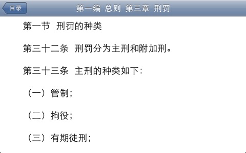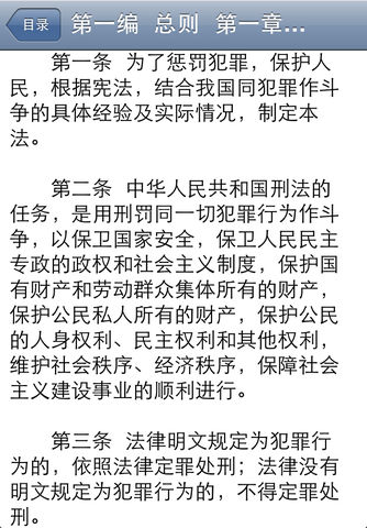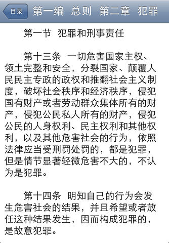 本软件为最新版的《中华人民共和国刑法》。刑法是规定犯罪、刑事责任和刑罚的法律,是掌握政权的统治阶极为了维护本阶级政治上的统治和经济上的利益,根据其阶级意志,规定哪些行为是犯罪并应当负刑事责任,给予犯罪人何种刑事处罚的法律。本法是为了惩罚犯罪,保护人民而制定的。本法规定了刑法的任务、基本原则和适用范围等多方面内容。 更新历史: 2011年4月 更新 “中华人民共和国刑法修正案(八)” 本书是每一个中国公民必读之书籍。通过阅读它,我们可以更好地保护自己的权利和利益! 本软件的主要功能和特色如下: 1、软件内置简体中文、繁体中文、官方英语三种语言,您可根据自己的需要自由切换。 2、全部文字均可复制和粘贴。您可将软件中的重要内容拷贝到他处。 3、永远最新的内容。当本法律被相关国家机构作出修订后,我们会在第一时间对软件进行升级,以使您手机中的法律条文保持最新。 4、准确的文字。书籍内容经过我们编辑的多次审核,最大程度地避免出现错字和别字。 5、良好的阅读体验。软件中内置了多种贴心化功能,为您提供流畅的阅读体验。 6、光辉出品,正版保证。本公司出品的所有书籍,均经过版权所有者的授权,您可放心购买。如需查看更多书籍,请搜索“GloryTimes Inc.”。 目录 第一编 总则 第一章 刑法的任务、基本原则和适用范围 第一编 总则 第二章 犯罪 第一编 总则 第三章 刑罚 第一编 总则 第四章 刑罚的具体运用 第一编 总则 第五章 其他规定 第二编 分则 第一章 危害国家安全罪 第二编 分则 第二章 危害公共安全罪 第二编 分则 第三章 破坏社会主义市场经济秩序罪 第二编 分则 第四章 侵犯公民人身权利、民主权利罪 第二编 分则 第五章 侵犯财产罪 第二编 分则 第六章 妨害社会管理秩序罪 第二编 分则 第七章 危害国防利益罪 第二编 分则 第八章 贪污贿赂罪 第二编 分则 第九章 渎职罪 第二编 分则 第十章 军人违反职责罪 附则 中华人民共和国刑法修正案(一) 中华人民共和国刑法修正案(二) 中华人民共和国刑法修正案(三) 中华人民共和国刑法修正案(四) 中华人民共和国刑法修正案(五) 中华人民共和国刑法修正案(六) 中华人民共和国刑法修正案(七) 中华人民共和国刑法修正案(八)