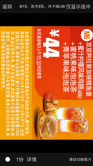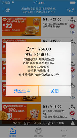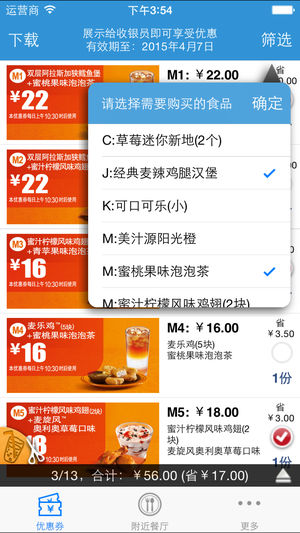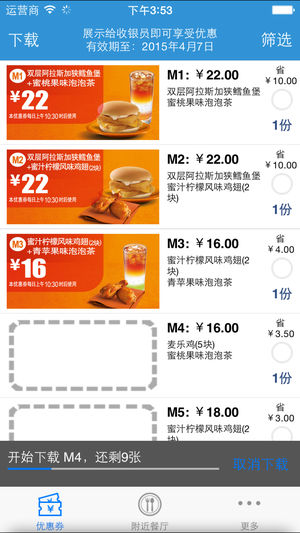 能省钱和赚钱的必备软件,占用资源少,起码可装个备用。 -------展示给收银员即可享受优惠------- 选好你需要的套餐,向柜台服务员展示即可,无需打印,非常方便 -------全国麦当劳通用------- 功能简介: 1、完美的离线功能 2、优惠券过期后能自动提示更新 3、可选择性下载需要的优惠券 4、提供过滤功能,通过需要购买的食品来选择优惠券 5、选好后,点显示图片给服务员看就好了:)支持手势操作哟 6、通过“附近餐厅”能快速找到附近吃饭的地方:)