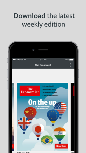 The Economist weekly magazine, digital edition Users on iOS 10.3 or above can explore an expanded version of this app, incorporating daily and weekly updates, along with a morning briefing by searching for ‘The Economist’. Readers can access their essential global briefing on current affairs, busi…