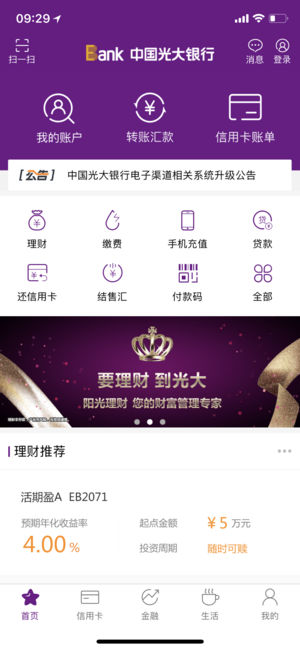 光大银行为您推出的新一代手机银行,不论您是否为光大银行的用户,均可享用手机银行提供的丰富服务。 *理财高收益:随时随地购买光大高收益理财产品。 我们还打造了专属理财,让您获得更好的收益回报。活期宝中的资金可实时转入转出。 *转账0费用:享受简单流畅手续费免费的转账服务。 短信验证码、动态令牌、登录密码保护,为您的资金安全提供全方位保障。 *管理多账户:账户余额交易明细各种信息一目了然。 收入支出自动记录,让您的每一分收入都更加明晰,享受更便利的现金管理服务。 *…