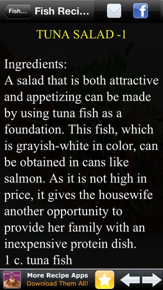 Big collection of 150+ Fish and Shell-Fish Recipes! Also Enjoy App Features Like: =>> Email Share =>> Facebook Share =>> Favorites The App includes the following Fish & Other Seafood Recipes: * Salmon * Codfish * Haddock * Halibut * Turbot * Shad * Blue-fish * Black-fish * White-fish * Sea-Bass * Rock-Bass * Sword Fish * Mullet * Mackerel * Eels * Lobsters * Oysters * Crabs * Shrimp * Clams * Scallops and more... => Complete App Features: >> No Internet Connection Required! >> Fast Loading Pages! >> Easy Browsing of Recipes! >> Over 150+ Popular Recipes! >> Mark Any Recipe as Favourite! >> Share Recipe via Email! >> Share Recipe via Facebook! Download this App Now and you could be cooking one of the Delicious Fish recipe today!