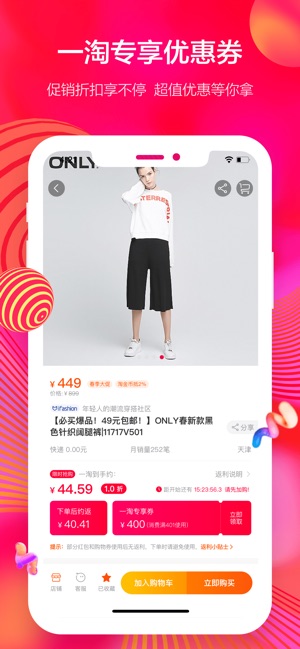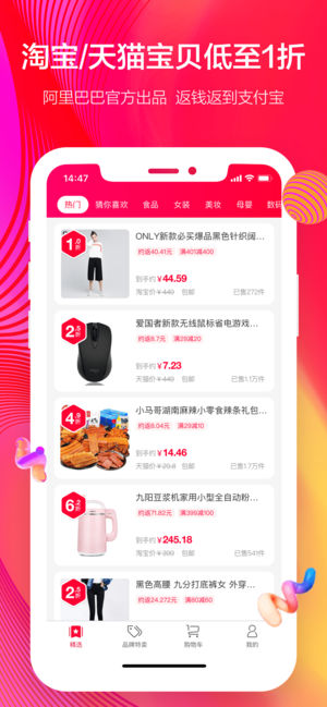 一淘是阿里巴巴旗下特卖返利平台,无需注册账号,淘宝账号一键登录,30秒淘宝购物车下单直接拿返利,最高返利80%,还可叠加专享大额优惠券,返利再减;一淘是精明用户不可少的省钱返利神器! 【淘宝出品】阿里巴巴集团旗下官方返利特卖APP,汇集淘宝,天猫海量返利和大额优惠券商品,商品全,返利额度高,官方渠道返利,直接返利到你的支付宝账号,安全无忧。再加上专享优惠券,省不停! 【产品特色】 1、 淘宝账号通用,无需单独注册;同步淘宝/天猫海量返利和优惠券商品。 2、 一淘专享大额优惠券,淘宝、天猫优惠券一网打尽,返利再用优惠券,省上省 3、 专属特卖,同步聚划算、淘抢购的精选活动,最高80%返利货优惠券…
