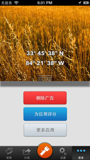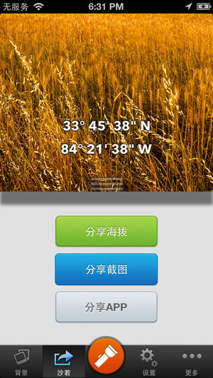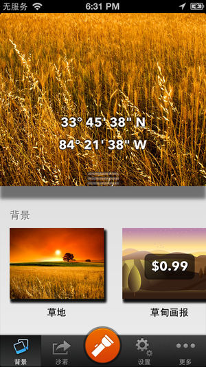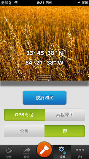 查看你的高度或海拔上,随着一天的时间调整令人惊叹的景观。 气压表:气压表可以让您根据气压变化测量您的高度变化。只需设置您的参考压力和高度,就可以看到高度计在两点的高度差。非常适合远足等户外活动。 指南针:显示实时的方向。 一个简单而整洁的界面如下: •海拔高程或 •纬度 •经度 产品特点 •最高的GPS的精确度 •从地形图值地面标高 •查看以英尺或米 •内置手电筒 共享 •分享截图与美丽的背景 •分享在Twitter,Facebook和电子邮件或文本消息 使用自定义背景升级从山顶拍照,并采取截图带有你的高度,以显示给你的家人和朋友。 背景(应用内购买): •草甸景观(图解) •都…