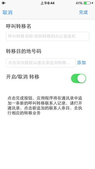 电话转移小助手帮助你方便快速设定电话转移业务,支持以下转移业务 1)无条件转移 2)遇忙转移 3)无应答转移 4)关机或无信号转移 5)呼叫等待 她保存设定的转移号码到通信录中,下次要激活该转移号码时,只要点击转移号码联系人就可以了,方便快捷 ***欢迎关注我们的微博来获取最新信息和使用帮助*** weibo.com/duoduomobile