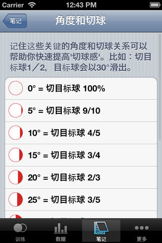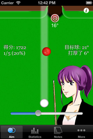 边玩边训练你的瞄准感觉! ★ 控制白球击打目标球! ★ 可选限时目标球分离角! ★ 重复打丢的球, 迅速提高球感! ★ 更多选项帮你提高! ★ 支持Game Center! 想成为正真的“进球机器”,要做到心手合一: 1. 切球感觉:准确清楚需要切目标球多少来打进球 2. 击打技巧:用前臂和手腕来执行计划 对于第2点,你必须到球桌前训练自己的身体,但是却可以用本应用来训练你的切球感觉。台球/斯诺克是记忆的运动。不管你只有几分钟,或半小时的时间,准度训练器让你在空闲时间训练你的切球感觉,让你在球桌前的训练更有价值! 准度训练器不仅让你随机地练习,与此同时,你的击球数据会被记录下来。你可以根据自己的弱点来设置本应用进行针对性的训练(比如:20-40°)。