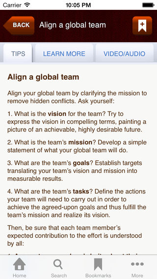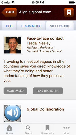 ***Note: iOS7 users are experiencing problems with launching the app, we are currently working on a solution.*** **Also, please note that the free iPhone version of Mobile ManageMentor allows you to browse one complete topic. If you would like access to all 11 topics, you may upgrade for $39.99 via in-app purchase.** Carry the world’s most trusted management advice in your pocket. Access proven tips, tools, and guidance on the most common business and management challenges from the experts in leadership and management development, Harvard Business Publishing. About This App Ever find yourself away from your desk or the office and faced with an urgent management issue? We have the resource you’ve been looking for. Powered by the proven content of Harvard ManageMentor, Mobile ManageMentor provides you with useful, easily accessible answers to common management challenges via your mobile device. Turn your phone into your personal management coach and get the answers you need, when you need them, wherever you are. What You Get - Over 100 management tips and tools provide guidance and practical support to solve common management challenges across a broad set of categories including: - Change - Communications - Developing Others - Finance - Innovation - Leading and Motivating - Marketing - Personal Development - Strategy - Teams - Workplace Issues - Supplemental content to help you gain a deeper understanding of the topic - Videos with personal stories from experts, leaders, and practitioners - Audio summaries of key management topic areas How It Works Simply type in your management challenge and instantly search for advice. Related management tips, videos, and audio clips are displayed below the search box. You can also filter the search results by content type -- tips or video/audio clips. Click on any item to view the content. You can also browse the management tips by clicking on category name. Mobile ManageMentor allows you to bookmark your favorite tips and even send them to your team or colleagues. Feedback and Support If you have any questions or feedback about Mobile ManageMentor, please contact CLProductFeedback@harvardbusiness.org. Key Benefits - Access moment-of-need performance support with tips, tools and advice, easily accessible on your mobile device - Get guidance on key management topics from world-class experts with content from Harvard Business Publishing - Forward your favorite tips to team members to extend the learning