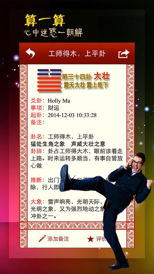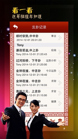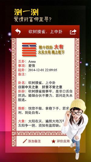 别感叹命运不公,改善命运有秘诀! 易经爻卦别开生面解决人生难题,阐述为人处事之道。 今日运势如何?财运如何? 爱与不爱,彷徨,迷茫,犹豫,人生十字路口,如何抉择? 易经爻卦,成就大事必备的应用程序,让您家人更健康,事业更美满! 有人问, 易经占卜能预测甚么?它的强项在那裡?其实易经的预测范围是非常广泛的。它能预测人际配合度、天气、失物、感情、求职等等....多不胜数。 《易经》虽然深奥而神秘, 一般人难以登堂入室, 但使用本软件进行预测, 却是人人可行的。本软件通过八卦进行信息预测的科学方法, 实现了包括财运,事业,爱情,婚姻,家庭等近40多种事项占卜, 对一切做到心中有数, 有备无患,已…