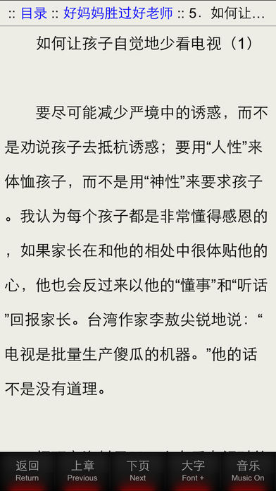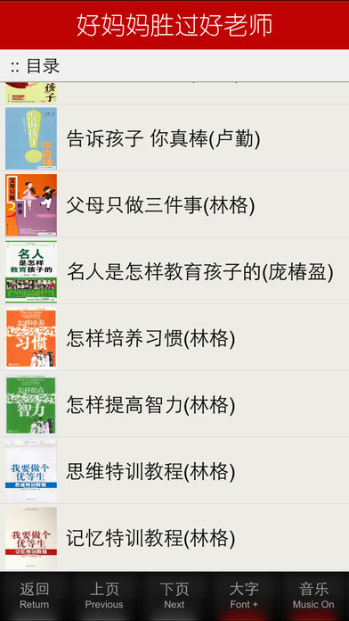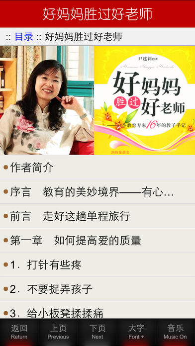 当当网畅销书排行版第3名,好妈妈胜过好老师。 感恩回馈(20140407):增加7本教育经典书籍。谢谢您的支持 学习的革命 哈佛女孩刘亦婷(张欣武 刘卫华) 告诉世界,我能行(卢勤) 好父母 好孩子(卢勤) 告诉孩子 你真棒(卢勤) 父母只做三件事(林格) 名人是怎样教育孩子的(庞椿盈) 感恩回馈(20120408):增加4本教育经典书籍。谢谢您的支持 怎样培养习惯(林格) 怎样提高智力(林格) 思维特训教程(林格) 记忆特训教程(林格) PR Reader 6.0, 为您提供最佳的阅读感受: 技术创新点: 1 智能书签:让你感觉爽的很 2 一键切换:简洁方便,在正常逻辑内,所有操作一键完成,不让您多点一次 3 满屏滚动2种阅读模式:滚动模式自由设置页面字数,自由选择您的阅读习惯 3 智能切换:翻页、章节、目录,全部智能判断,自动切换。支持任意位置添加目录自由图片 4 树状分类:相对于一本书,PR Reader提供是一组书,例如,对于某本小说,可以将作者生平资料,书籍分析后记,书籍评论,全部组织提供给您 5 历史前进后退:延续电脑阅读模式 PR Reader ,还会为您做更多…… 期待你的建议,一定尽快响应,请邮件至:procorosso2011@hotmail.com 好妈妈胜过好老师 妈妈是朋友,妈妈是老师,妈妈是孩子的引路人,妈妈教育方法的差别,常常影响孩子的一生。 本书作者既是好妈妈又是好老师,写本书意在沟通学校教育和家庭教育,因有感于家庭教育的被忽视与不得法,而取名为“好妈妈胜过好老师”。 这是一本有勇气、有思想、有智慧的书,是难得的家教读本,既敢直面教育问题,又深入地思考;有独到的教育观念,更有教育智慧,最重要的还有无所不在的爱心。 本书可供家长读、教师读,像我这样关心教育的人也会从中得到效益。 目录: 作者简介 序言 教育的美妙境界——有心而无痕 前言 走好这趟单程旅行 第一章 如何提高爱的质量 1.打针有些疼 2.不要捉弄孩子 3.给小板凳揉揉痛 4.每年都来的圣诞老人 5.长大要和马晓飞结婚 6.像牛顿一样 7.古诗滋养的孩子 第二章 把学习做成轻松的事 1.让孩子识字不难 2.开“小卖部” 3.被魔杖点中的孩子学习能力强 4.修得一支生花笔 5.“好阅读”与“坏阅读” 6.阅读需要诱惑 7.不看“有用”的书 8.学“语文”不是学“语文课本” 9.写作文的最大技巧 第三章 一生受用的品格教育 1.孩子是从哪里来的 2.孩子天生不会说谎 3.可不可以批评老师 4.遇到一个“坏小子” 5.比黄金珍贵的四个字 6.“成人仪式”写给女儿的信 第四章 培养良好的学习习惯 1.“不陪”才能培养好习惯 2.惩罚你,不让你写作业 3.替孩子写作业 4.不写“暴力作业” 5.学习不要“刻苦努力” 6.不考100分 7.考好了不奖励 第五章 做家长应有的智慧 1.自己不带孩子就是渎职 2.幸福的家就是五星级宾馆 3.只设“记功簿”不设“记过簿” 4.“不管”是最好的“管” 5.做“听话”的父母 6.学会开“家长会” 7.不做穿西装的野人 第六章 小事儿就是大事情 1.女儿的“隐私” 2.如何让孩子爱吃饭 3.睡觉不怕吵学习不怕吵 4.不怕小动物 5.如何让孩子自觉地少看电视 6.小小独行侠 7.上海遇骗记 第七章 走出坑人的教育误区 1.河流可以是粉色的 2.不上学前班 3.暴力作业就是“教育事故” 4.不是电脑游戏的错 5.“儿童多动症”是个谎言 参考文献 后记